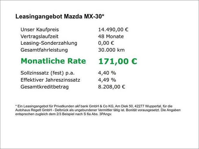 Zum Vergleich hinzufügenMazda MX-30 First Edition e-SKYACTIV HUD AD Navi digitales Cockpit Memory Sitze LED Sc First Edition e-SKYACTIV HUD AD Navi digitales Cockpit Memory Sitze LED ScheinweInt. Nr.: 0110198Gebrauchtfahrzeug36.164 km01.12.2020107 kW/ 145 PSWeißAutomatikElektro33129 Delbrück - Westenholz14.490 €MwSt. ausw.DetailsDetailsVorschauSchließenAusstattungBeschreibung15 BilderKontaktieren