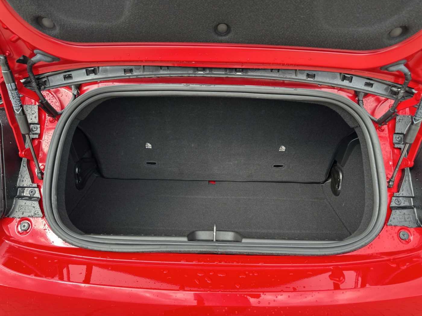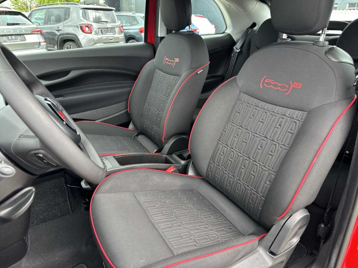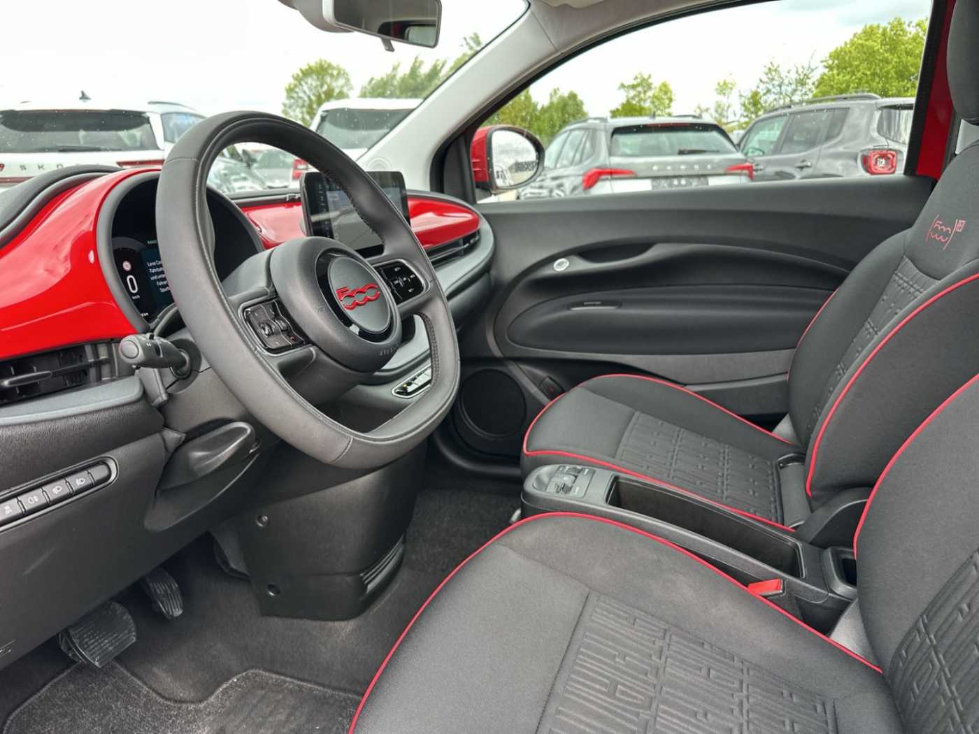 - Weiteres: Antriebs-Schlupfregelung (ASR), Sitzbezug / Polsterung: Stoff, Heckleuchten LED, Ambiente-Beleuchtung, Einparkhilfe hinten, Fernbedienung für Zentralverriegelung und Verdeck, Armaturenbrett farbig, Sonderlackierung Rot, Elektromotor 70 kW (cont. 43 kW), Beifahrerairbag abschaltbar, Fahrmodusschalter, Geschwindigkeits-Regelanlage (Tempomat), Heckscheibe heizbar, Infotainment-System: UConnect 5 mit Navigationssystem, DAB+ und Bluetooth-Freisprecheinrichtung (Touchscreen 10,25 Zoll), Kopfstützen hinten, Memoryfunktion für Sitz vorn links, Smartphone Schnittstelle (Apple CarPlay & Android Auto), Wärmeschutzverglasung, Regen-/Lichtsensor, Sitzheizung vorn, Tagfahrlicht LED, USB-Schnittstelle, Airbag Fahrer-/Beifahrerseite, Elektron. Stabilitäts-Programm (ESP / ESC), Kopf-Airbag-System vorn, Lenksäule (Lenkrad) höhenverstellbar, Notrufsystem (eCall), Seitenairbag vorn, Fensterheber elektr. vorn mit Komfortschaltung, Antriebsart: Frontantrieb, Aufmerksamkeits-Assistent, Autom. Begleitfunktion der Beleuchtung (Follow me home), Autonomer Notbrems-Assistent (AEB), Bremsassistent, Fensterzierleisten verchromt, Handschuhfach beleuchtet, Induktionsladeschale für Smartphone, Keyless-Entry & Go, Klimaautomatik, Mobile Online Dienste UConnect Live, One Pedal Drive (elektronisches Gaspedal), Parkbremse elektrisch, Radioempfang digital (DAB+), Rückfahrkamera Park View, Scheibenwischer beheizbar, Spurhalteassistent, Verdeckbezug Stoff schwarz, Verkehrszeichenerkennung, Winter-Paket