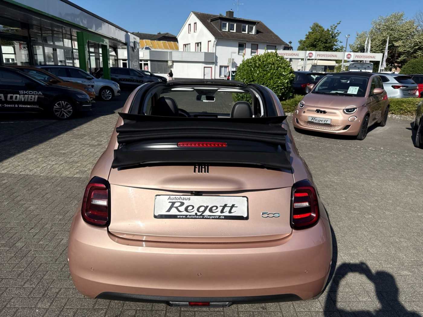 - Weiteres: Antriebs-Schlupfregelung (ASR), Sitzbezug / Polsterung: Stoff, Geschwindigkeits-Regelanlage (Tempomat), Heckleuchten LED, Ambiente-Beleuchtung, LM-Felgen, Fernbedienung für Zentralverriegelung und Verdeck, Elektromotor 87 kW (cont. 43 kW), Beifahrerairbag abschaltbar, Fahrmodusschalter, Heckscheibe heizbar, Infotainment-System: UConnect 5 mit Navigationssystem, DAB+ und Bluetooth-Freisprecheinrichtung (Touchscreen 10,25), Kopfstützen hinten, Memoryfunktion für Sitz vorn links, Regen-/Lichtsensor, Smartphone Schnittstelle (Apple CarPlay & Android Auto), Wärmeschutzverglasung, Einstiegsleisten (verchromt), Scheinwerfer LED, Mittelarmlehne vorn, Sitz vorn links verstellbar (6-fach), Außenspiegel elektr. verstell- und heizbar, beide, Induktionsladeschale für Smartphone (Wireless Charging), Rückfahrkamera mit 360° Surround View, Innenspiegel mit Abblendautomatik, Seitenscheiben hinten abgedunkelt, Tagfahrlicht LED, Fensterheber elektrisch vorn, USB-Schnittstelle, Airbag Fahrer-/Beifahrerseite, Elektron. Stabilitäts-Programm (ESP / ESC), Kopf-Airbag-System vorn, Lenksäule (Lenkrad) höhenverstellbar, Notrufsystem (eCall), Seitenairbag vorn, Rücksitz geteilt / klappbar, Sonderlackierung Uni, Antriebsart: Frontantrieb, Aufmerksamkeits-Assistent, Autom. Begleitfunktion der Beleuchtung (Follow me home), Autonomer Notbrems-Assistent (AEB), Autonomes Fahren Level 2, Bremsassistent, Fernlichtassistent, Fiat Co-Driver-Paket 2, Keyless-Entry & Go, Klimaautomatik, Komfort-Paket, Ladekabel mit Typ 2-Stecker (Mode 3), Magic-Eye-Paket 1, Mobile Online Dienste UConnect Live, One Pedal Drive (elektronisches Gaspedal), Parkbremse elektrisch, Radioempfang digital (DAB+), Rückfahrkamera Park View, Spurhalteassistent, Style-Paket, Totwinkel-Assistent, Verkehrszeichenerkennung