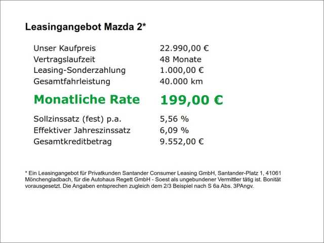 Zum Vergleich hinzufügenMazda 2 Hybrid Centre-Line 1.5 EU6e ACC Apple CarPlay Android Auto Klimaautom Musikstr Int. Nr.: a407188dk1Neufahrzeug0 km85 kW/ 116 PSGrauAutomatikHybrid - Super/Elektro59494 Soest Energieverbrauch kombiniert: 4,2 l/100kmCO₂-Emissionen kombiniert: 97 g/kmCO₂-Klasse: CInformation über den Energieverbrauch und die CO₂-Emissionen des neuen PKW22.990 €MwSt. ausw.DetailsDetailsVorschauSchließenAusstattungBeschreibung15 BilderKontaktieren